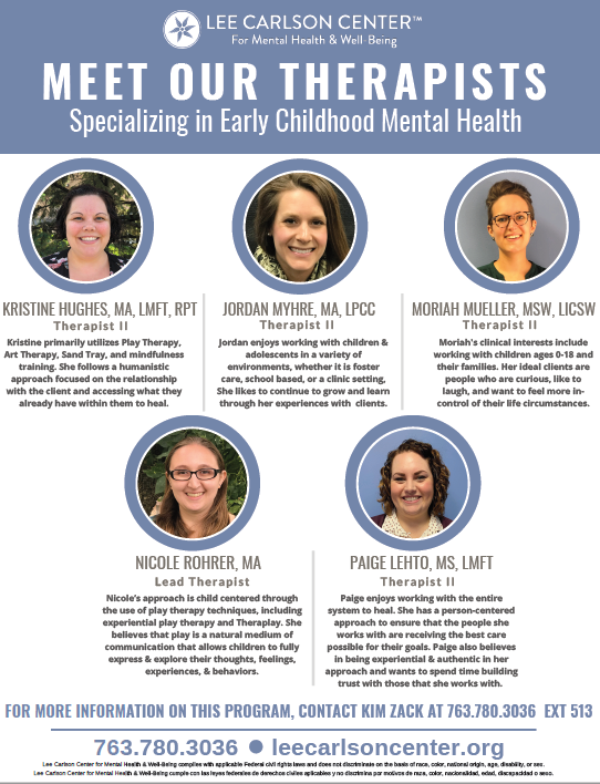 We know that parenting infants and toddlers can be challenging. Let our early childhood experts help to reduce stress and create a strong relationship between you and your young child. Call Lee Carlson Center at 763-780-3036 to learn more!